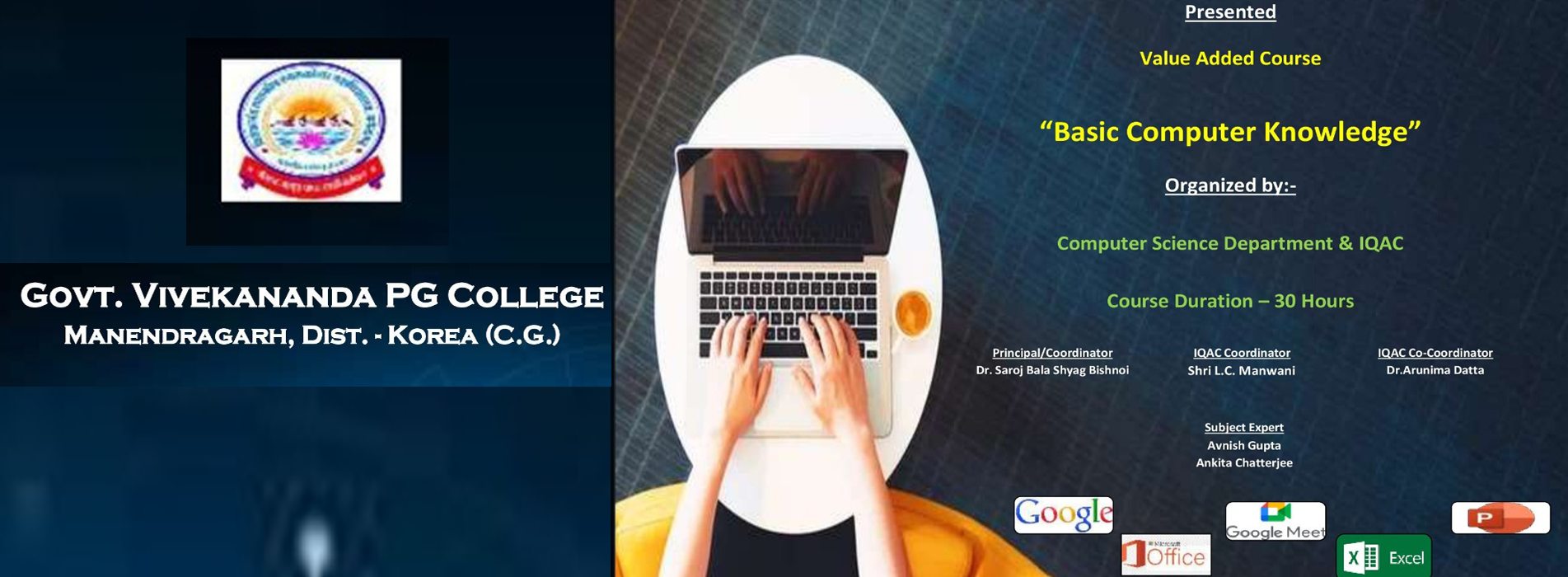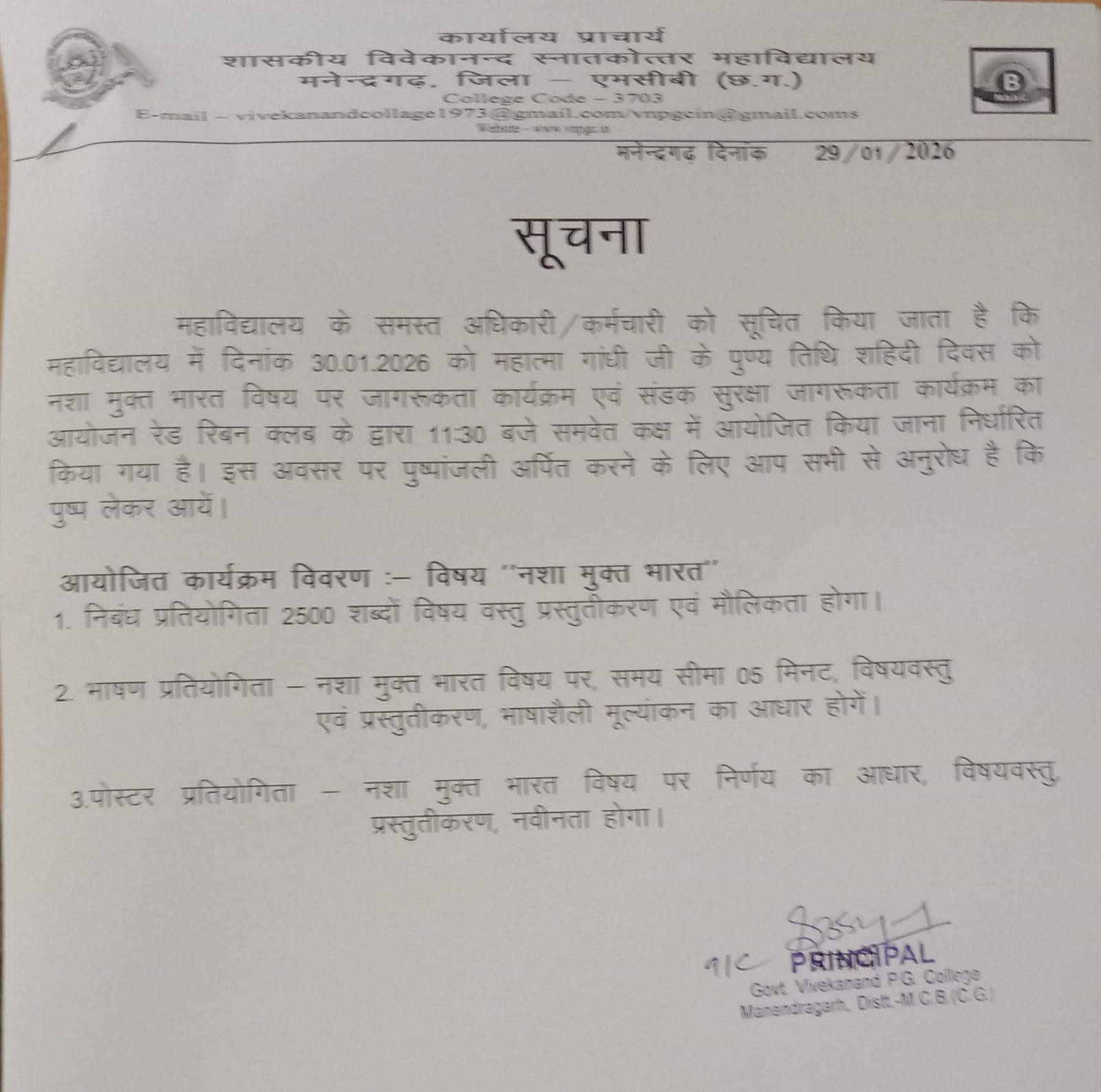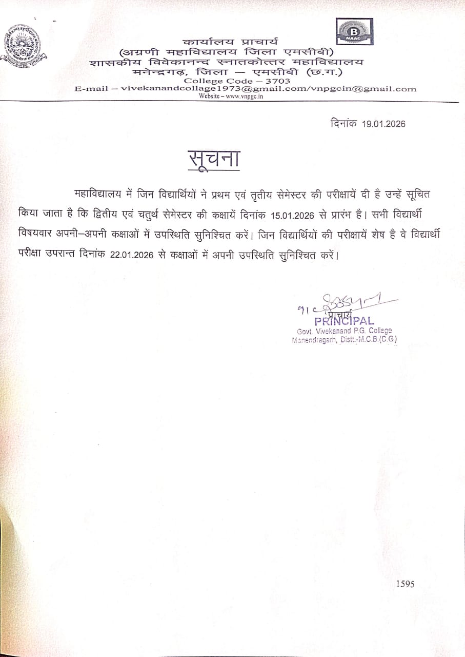 It is with immense pride and pleasure that I welcome you to Govt. Vivekanand PG College, Manendragarh, MCB, Chhattisgarh. Our institution stands as a beacon of academic excellence, fostering a culture of intellectual growth, innovation, and holistic development. Guided by the principles of Swami Vivekananda, we strive to empower our students with knowledge, values, and skills that prepare them to face the challenges of a dynamic world.